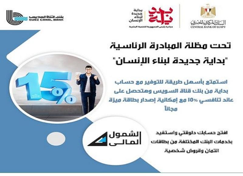 ويقدم بنك قناة السويس حساب بداية للعملاء بعائد تنافسي 15% مع إمكانية إصدار بطاقة ميزة مجاناً.