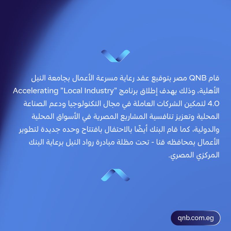 قام بنك QNB مصر بتوقيع عقد رعاية مسرعة الأعمال بجامعة النيل الأهلية، وذلك بهدف إطلاق برنامج ”Accelerating ”Local Industry 4.0 لتمكين الشركات العاملة في مجال التكنولوجيا ودعم الصناعة المحلية وتعزيز تنافسية المشاريع المصرية في الأسواق المحلية والدولية.